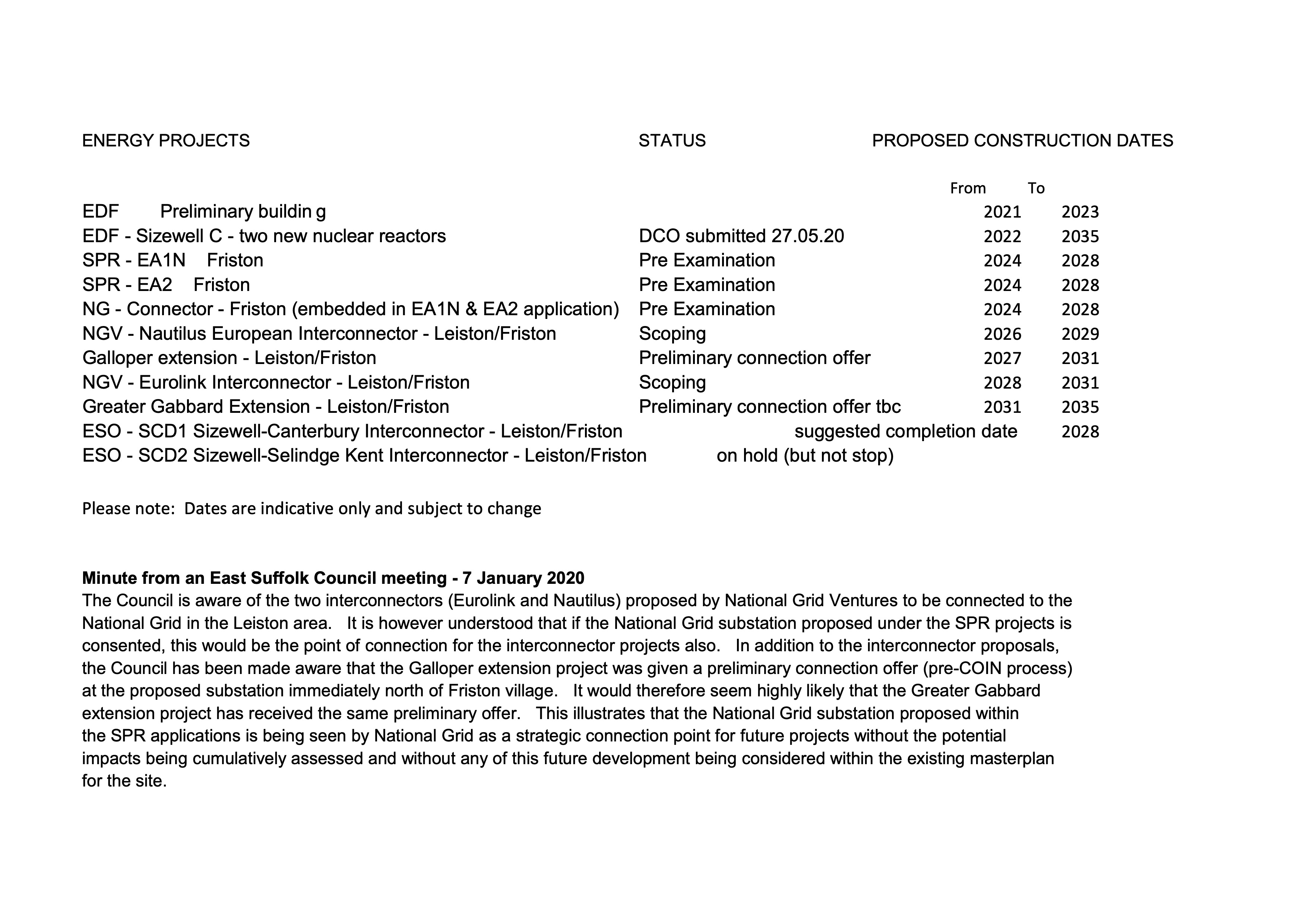 The town and parish councillors’ joint letter of 3rd March to the Secretary of State for Business, Energy & Industrial Strategy requesting an urgent review of the cumulative impact of all the major energy projects planned for this area was approved and adopted by SALC and more recently, too, by the National Association of Local Councils. As these projects would affect all of us in East Suffolk in some way, it is vital we continue to engage with the process robustly. The energy companies will claim an economic case for greenlighting these projects. Our view remains that their development will cause irreparable environmental damage to this area and have a very negative economic impact on our valuable tourism industry just as businesses in the area are trying to recover from lockdown. The attached timetable for all the energy projects proposed over the next 15 years illustrates the huge scale of industrialisation being proposed.